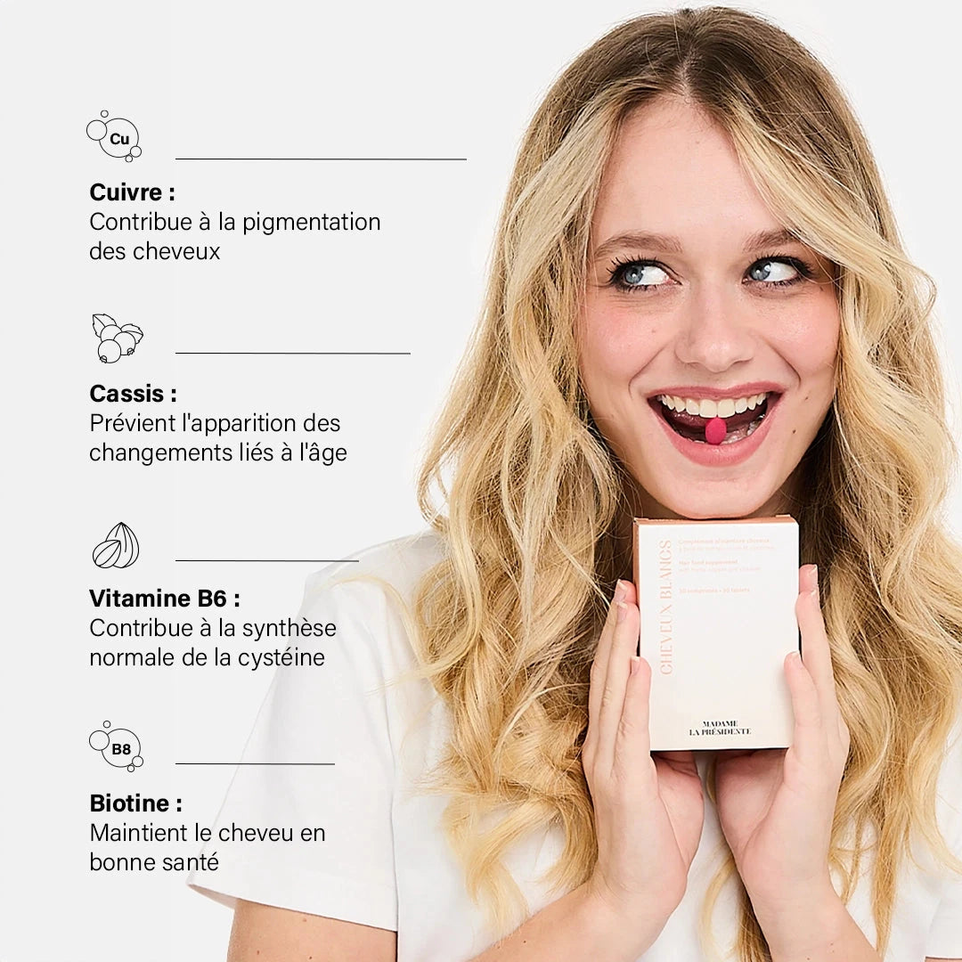 Formulé en laboratoire, Cheveux blancs contient du cassis, de la myrtille, du cuivre, des vitamines B6 et B8.