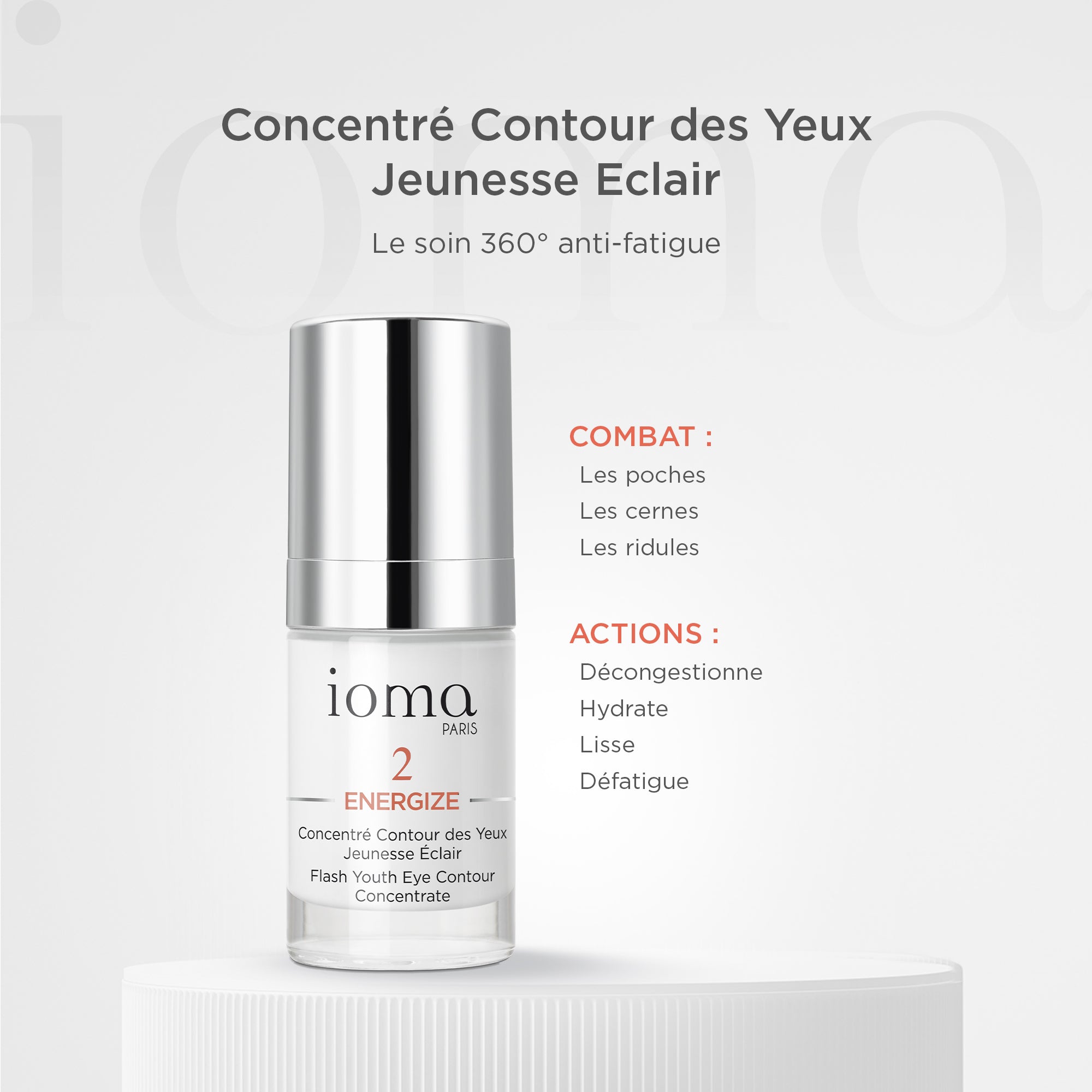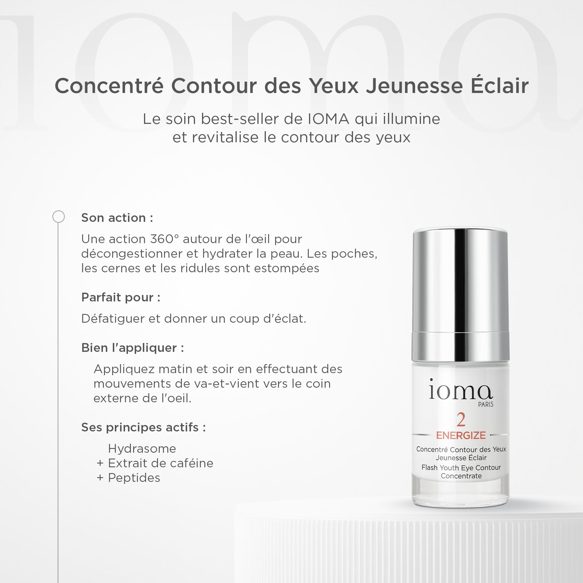 Un soin contour des yeux à l’action 360° : anti-cernes, anti-poches et anti-relâchement paupières. Ce concentré de soin hydrate et apaise la peau, stimule la microcirculation, et lisse visiblement le contour de l’œil pour un regard frais et reposé. Il a une action sur la paupière inférieure et la paupière supérieure.