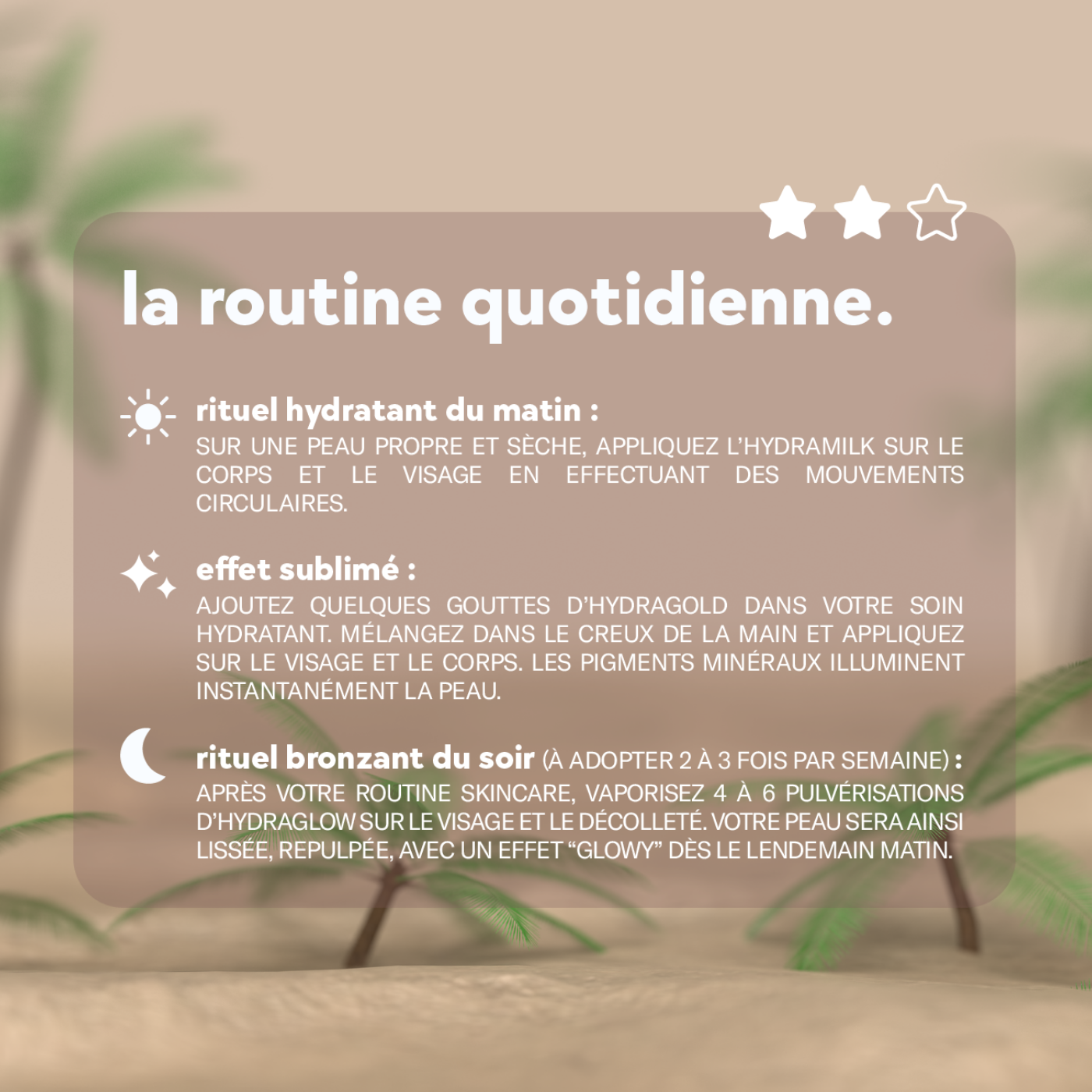 La routine quotidienne : Convient pour tous les jours et assure une hydratation maximale du visage et corps.