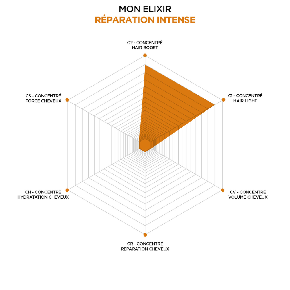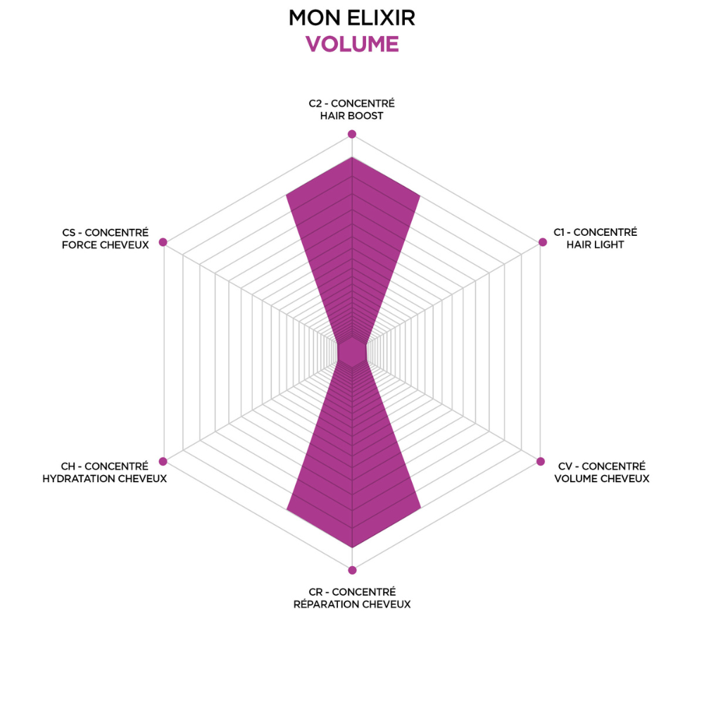 Mon Élixir Sérum Personnalisé Cheveux, le seul soin capillaire multidimensionnel personnalisé, pour traiter les besoins des cheveux et leur apporter 6 bénéfices : Hydratation, Réparation, Nutriment, Brillance, Volume et Force.