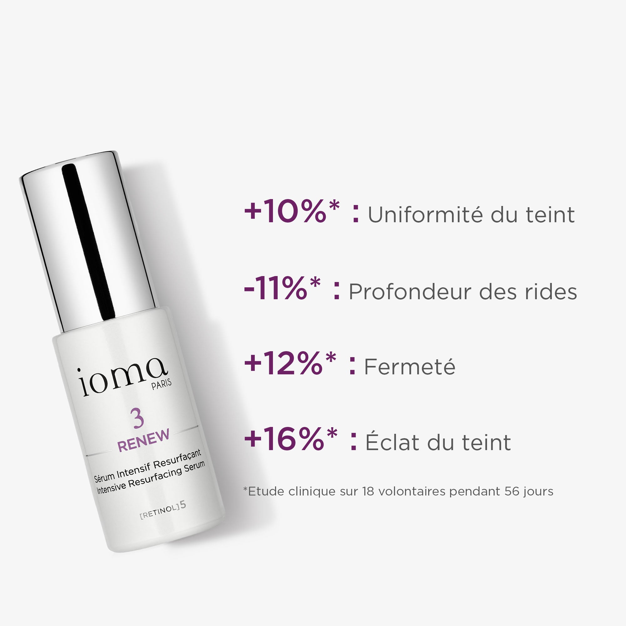 La puissance du rétinol capturé dans le complexe [RETINOL]5, une association de 5 actifs rétinol-like, analogues au rétinol, dont 0,3% de rétinol pur. Le sérum offre une action sur 5 dimensions de l’âge : les rides, les taches, la fermeté, le grain de peau et l’éclat. Grâce à son action resurfaçante intense, il combat les signes les plus prononcés de l’âge : rides, ridules, relâchement cutané et taches pigmentaires.