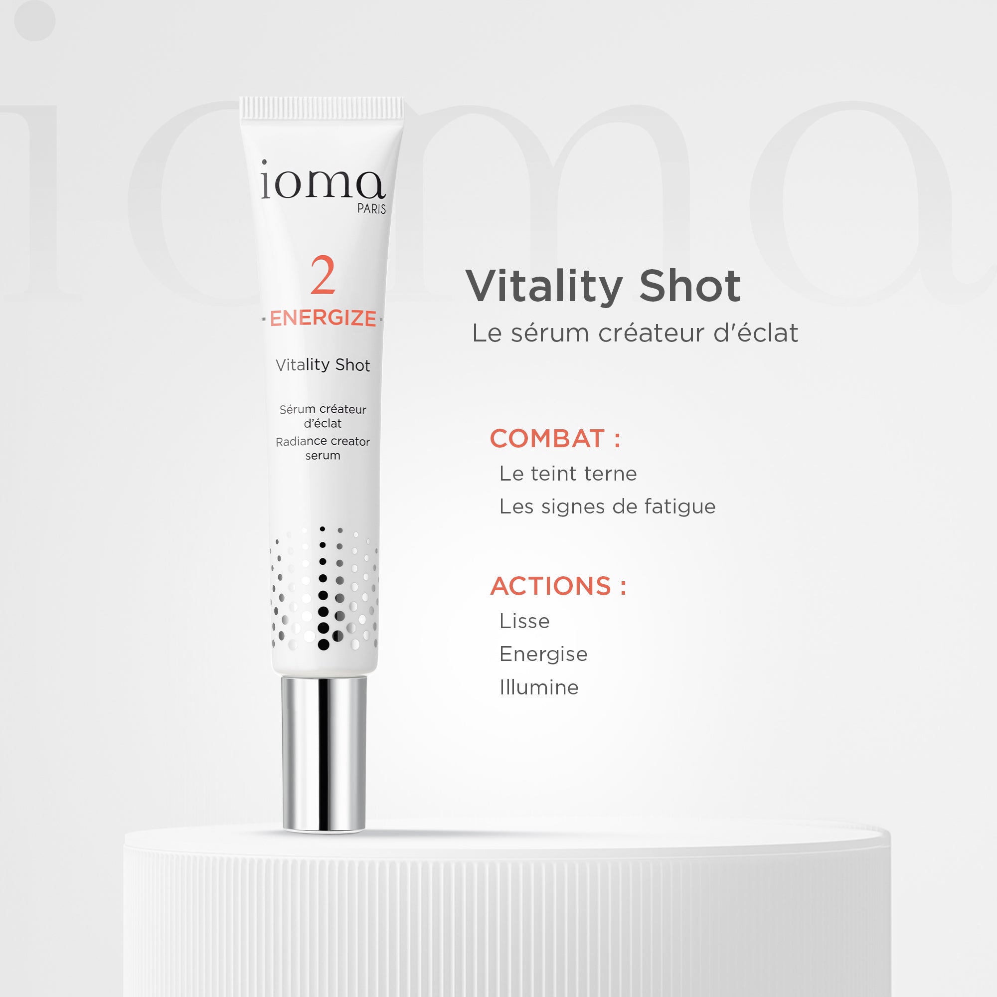 À partir d’un complexe unique d’actifs, le sérum Vitality Shot recrée l’éclat du teint instantanément et durablement. Véritable bouclier anti-pollution, il est enrichi en vitamines, protège et lisse la peau du visage.